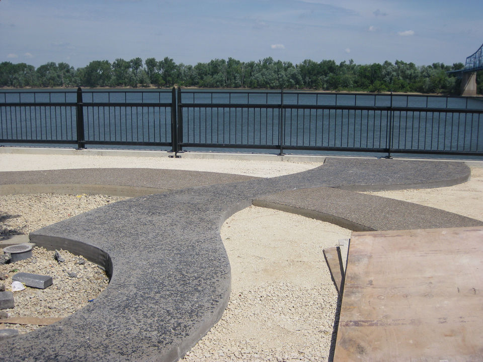 Project consisted of all decorative concrete flat work, curb banding, curb and gutter, brick paver base and roadway pavements thought Smoothers Parks, River Walkway, surrounding streets and sections around the new Convention Center. One of the concrete wave patterns throughout the park and streetscape was poured with a "cool gray" grout mix with Black Obsidian Stone broadcast on the top surface of the concrete then washed off similar to exposed aggregate. The Black Obsidian Stone had to be freighted from a quarry in Colorado. A unique feature of the project was the decorative Paddle Wheel that was constructed behind the Hampton Inn.